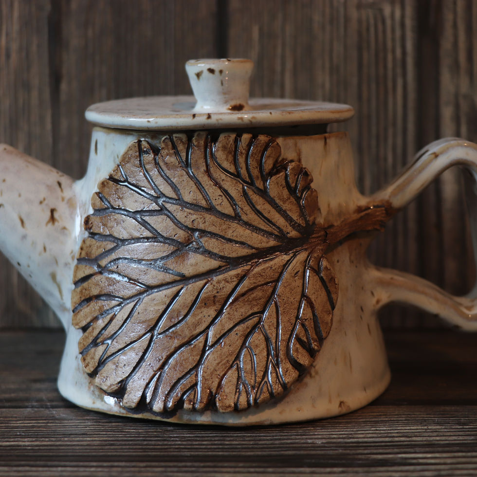 Tetera rústica de cerámica de gres con hojas auténticas prensadas sobre arcilla. Estas impresiones de hojas realzan las texturas y detalles naturales, creando patrones asimétricos únicos que evocan una sensación orgánica y natural. El diseño captura la esencia de la naturaleza, lo que la convierte en la pieza perfecta para darle un toque natural a tus momentos de té.