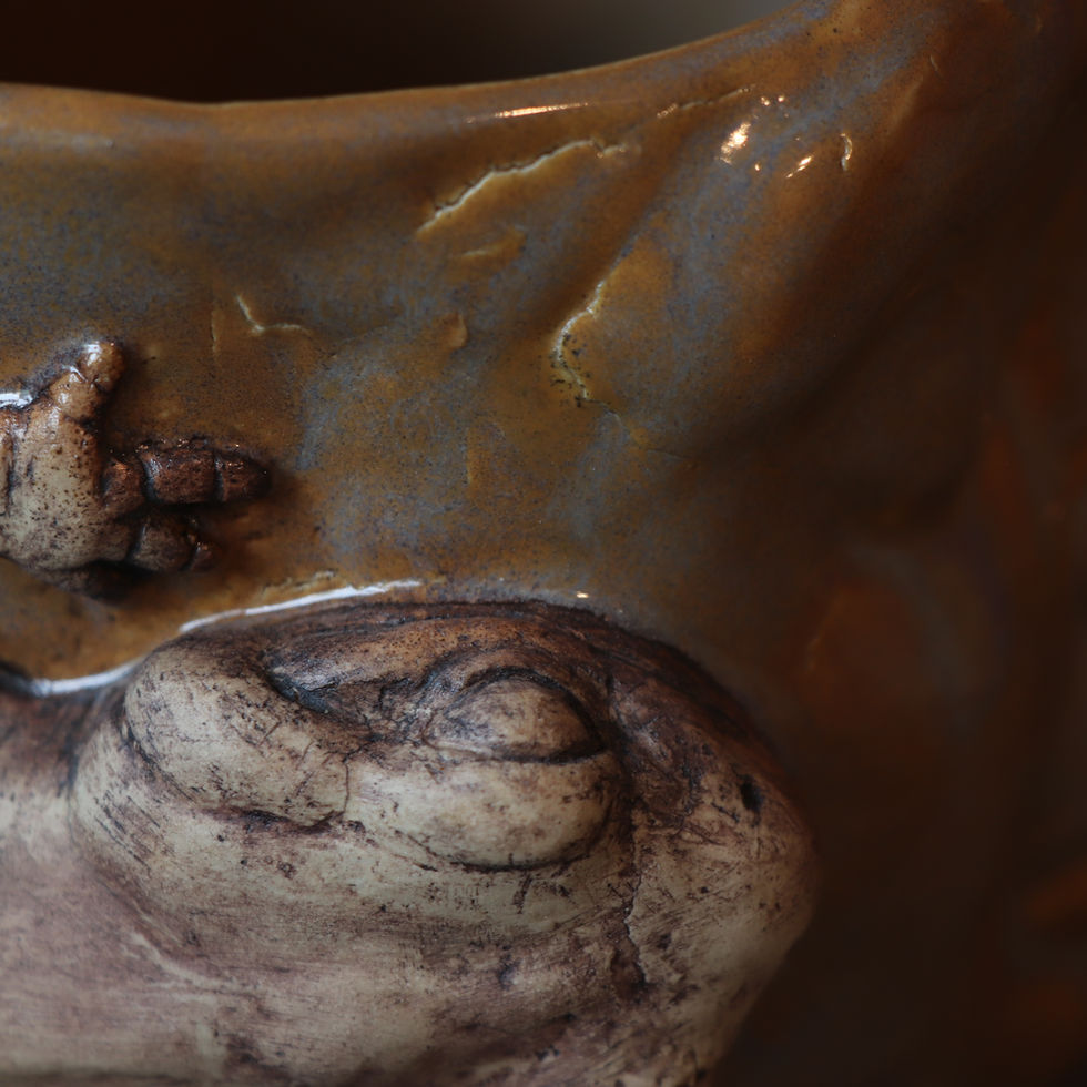 La pieza utiliza un esmaltado ocre brillante con un tono cálido y profundo que evoca la tierra seca y la piedra envejecida, realzando su carácter terroso y artesanal. El tono rojizo pálido y mate de la salamandra, similar a la arcilla y opaco, ofrece un suave contraste con el ocre brillante. Esta diferencia de textura y color crea una presencia equilibrada, cálida y serena que conecta ambos elementos con el mundo natural.